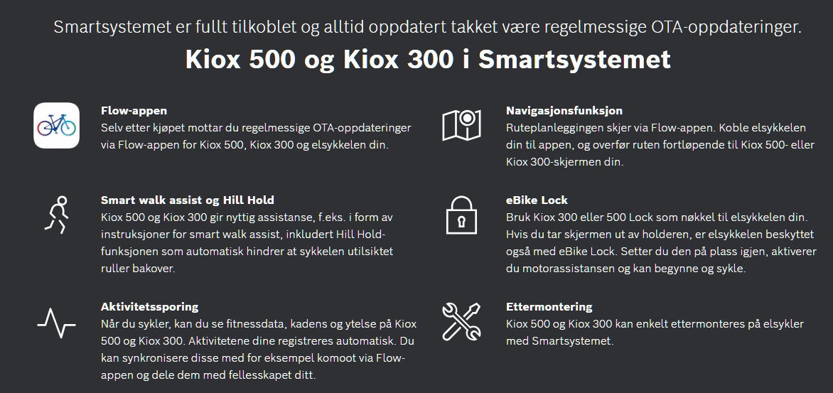 Bosch Kiox 300 er det nyeste Display fra Bosch, og passer kun deres nye Smart System. Med Kiox 300 kan du selv oppdaterte displayet for grunnleggende software oppdateringer, uten å måtte gå til et sykkelverksted.