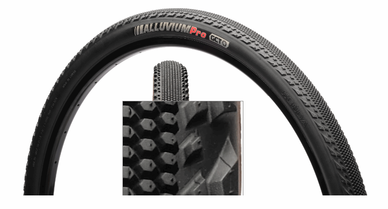 The Kenda Alluvium Pro is an all-new gravel and adventure tire that is as capable on pavement as it is on hard conditions single track trails. A tread design optimized for speed, with low profile knobs to aid in reducing rolling resistance, combined with a new single tread rubber compound, the Alluvium offers speed and grip. The GCT casing wraps the tire from bead to bead with a secondary casing layer acting as a shield against punctures and sidewall slashes. Tubeless set is made even easier with the GCT casing.