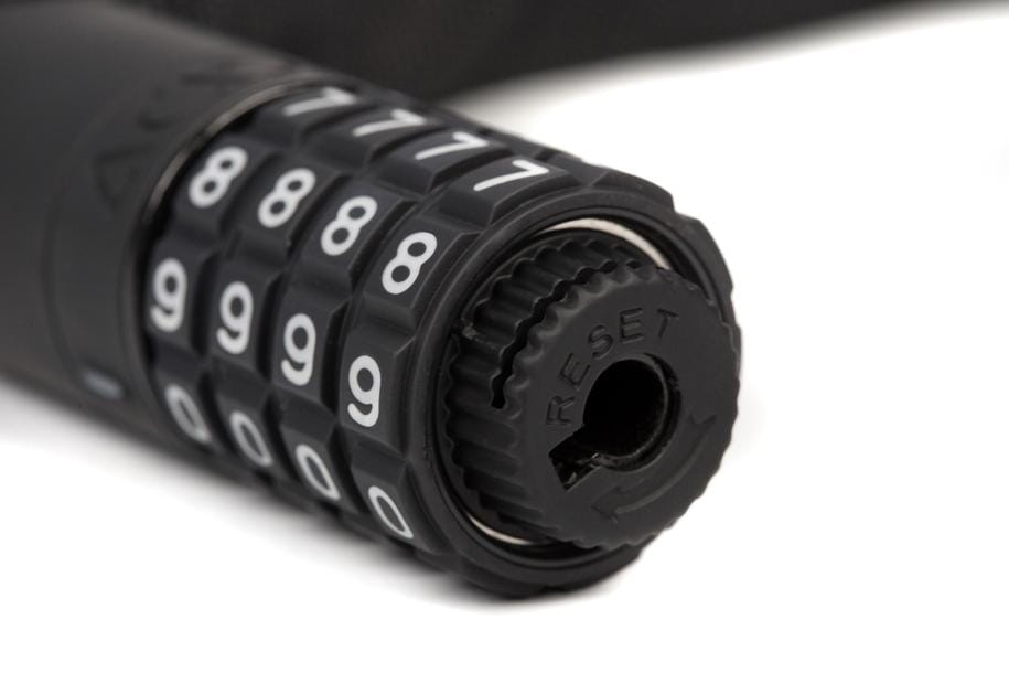 The extra-secure chain lock in our CORVID C range is virtually noiseless yet incredibly sturdy with a tear-resistant, hard-wearing textile sleeve. A rubberised surface prevents corrosion and protects your frame against scratches. GRIP+ technology on the lock body and combination wheels ensures maximum grip. Personalisable combination.