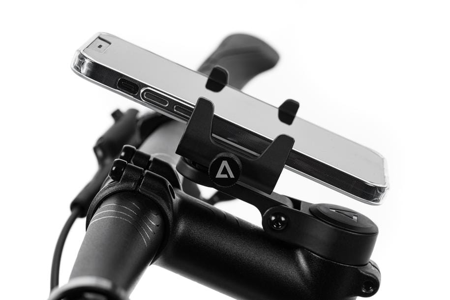 adjustable phone mount; for phone widths of 67–82 mm; compatible with all phone lengths; 360° rotation; infinite vertical adjustment; adjustable angle; silicone pads for extra grip; phone sits centrally on stem; affixes to headset; suitable for 1 1/8in head tube diameter; depending on the stem, a spacer must be fitted; depending on the stem, a longer screw is required; stackable adapter; compatible with ACID Bottle Cage Adapter Headset