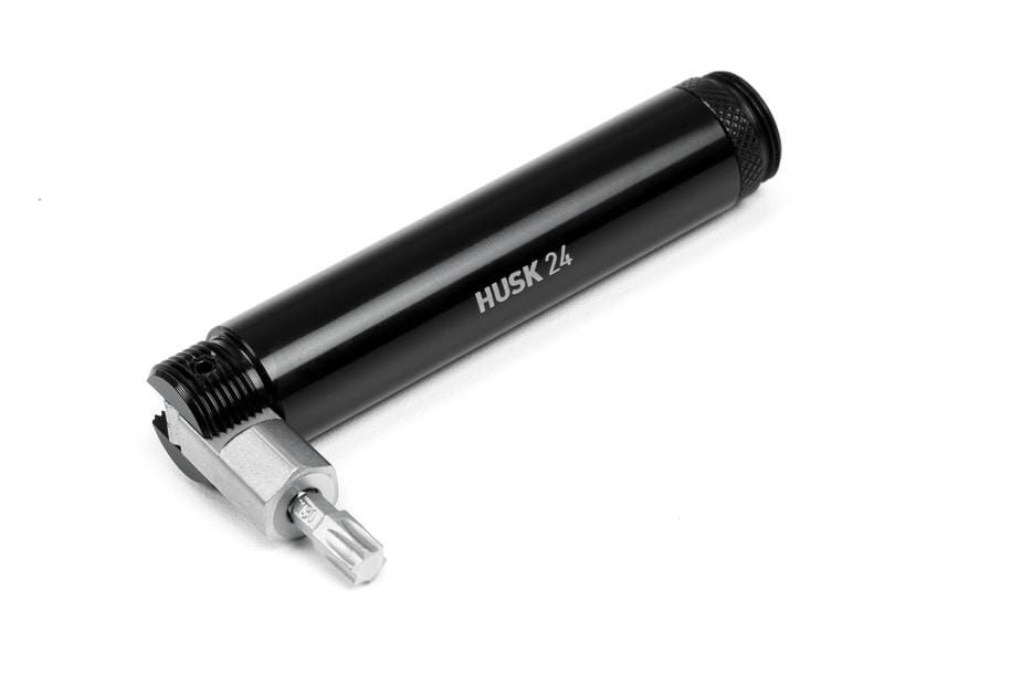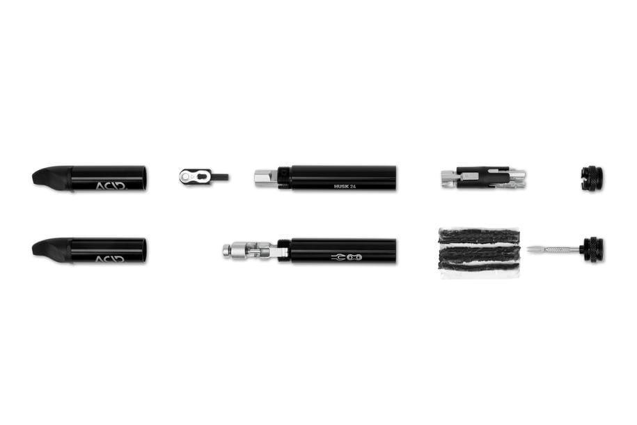 The ACID Multi Tool HUSK 24: a premium yet compact tool kit in a super-cool design. The two metal tubes with tyre levers at each end fit snugly in your hand. Inside, you'll find another 23 functions all neatly protected against dust and dirt. The chain tool and bit extension open up 90° for better leverage. The two HUSK 24 tubes can be hidden away inside your handlebars using the ACID GILink for HUSK or mounted to the bottle cage using the ACID Frame Mount.