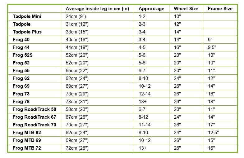 Frog Bikes 44 passer for barn i alderen 4–5 år med ca. 44 cm innvendig benlengde. Se størrelsesdiagram for veiledning. Frog Bikes gjør størrelsesvalget enkelt: det er barnets innvendige benlengde som avgjør riktig størrelse, og modellene er derfor navngitt etter dette målet.