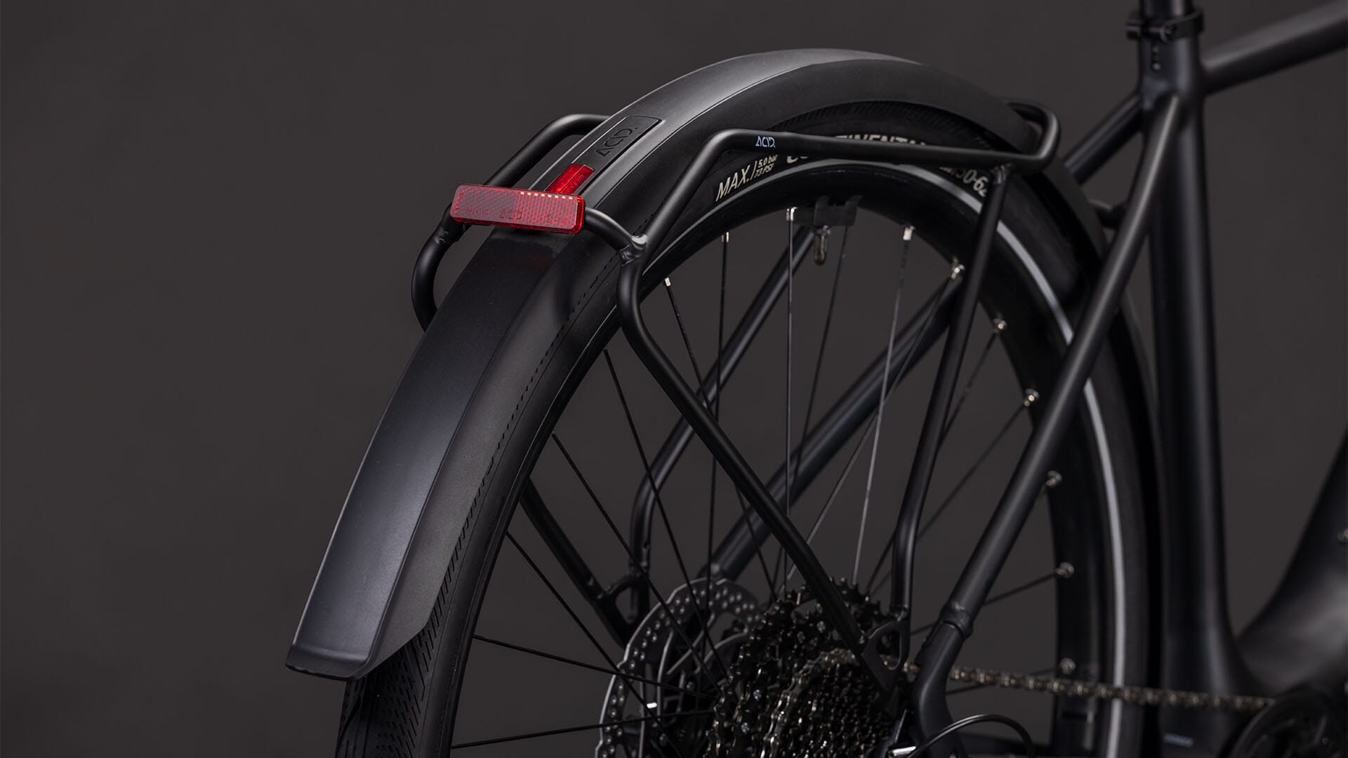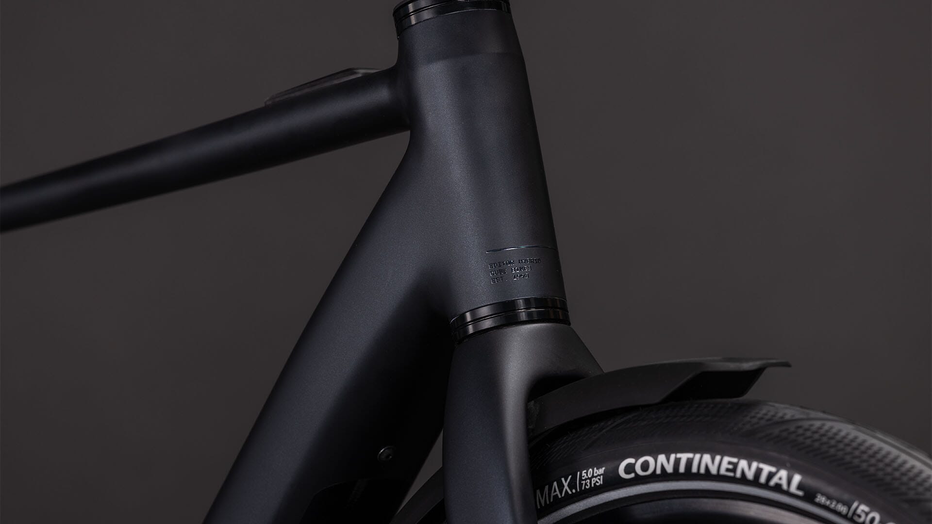 So sleek and understated is the Editor Hybrid FE's frame, at first glance it barely looks like an e-bike. Lightweight, durable aluminium construction with Smooth Welding at the main tube joints creates an elegant frame, while the full carbon fork is both light and strong. We integrated the cables to complement the frame's clean lines, and the 400Wh battery is built into the down tube to save space and weight. There's a versatile, rugged rear carrier and an optional front carrier for carrying your belongings. And we included full mudguards, a bright lighting set and a practical kickstand, so you've got everything you need.
