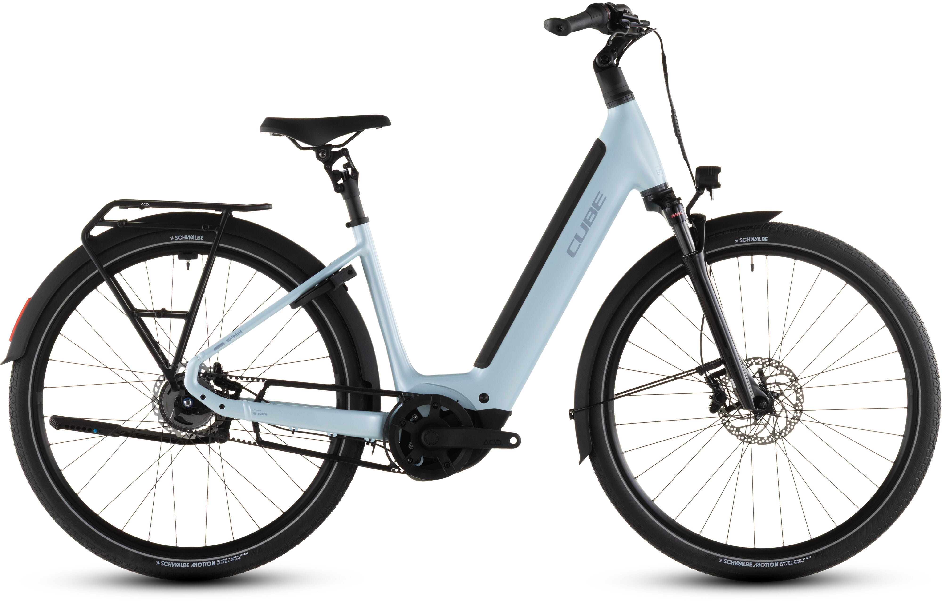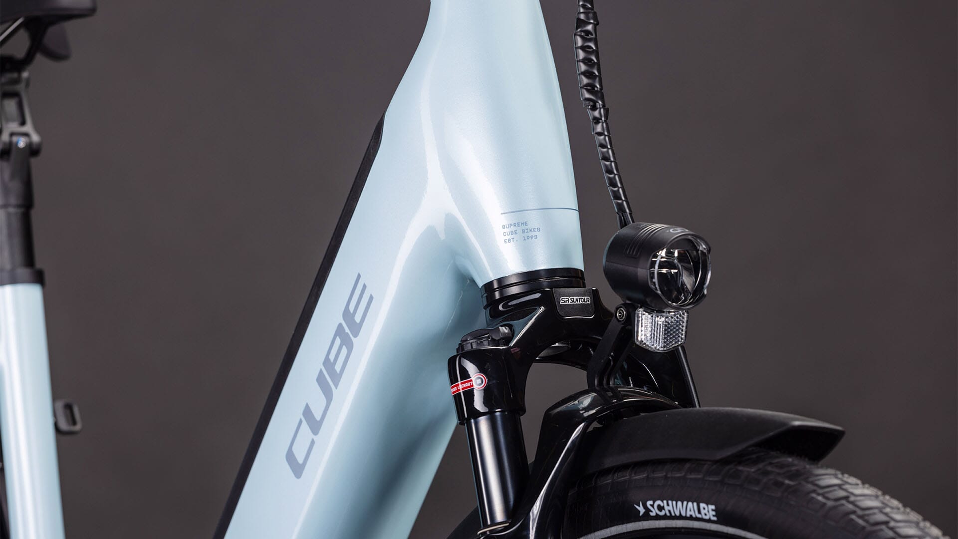 CUBE design is all about innovation, form and function – so you won't ever see anything unnecessary on our bikes. The Supreme RT Hybrid Deluxe EX's coaster brake is in addition to its powerful hydraulic disc brakes, because we think the convenience and immediacy of a pedal-activated brake can contribute to safety. The clean, quiet and low-maintenance Gates belt drive is another easy-to-live-with feature, as are the mudguards, lighting set, kickstand and Semi Integrated Carrier 2.0. Fast-rolling and grippy Schwalbe 50mm tyres are also part of the package. There's an air-sprung suspension fork, parallelogram suspension seatpost and adjustable stem for added comfort, and the 5-speed Shimano hub gears work seamlessly with the Bosch Performance drive and 600Wh battery to get you there and back, every time.